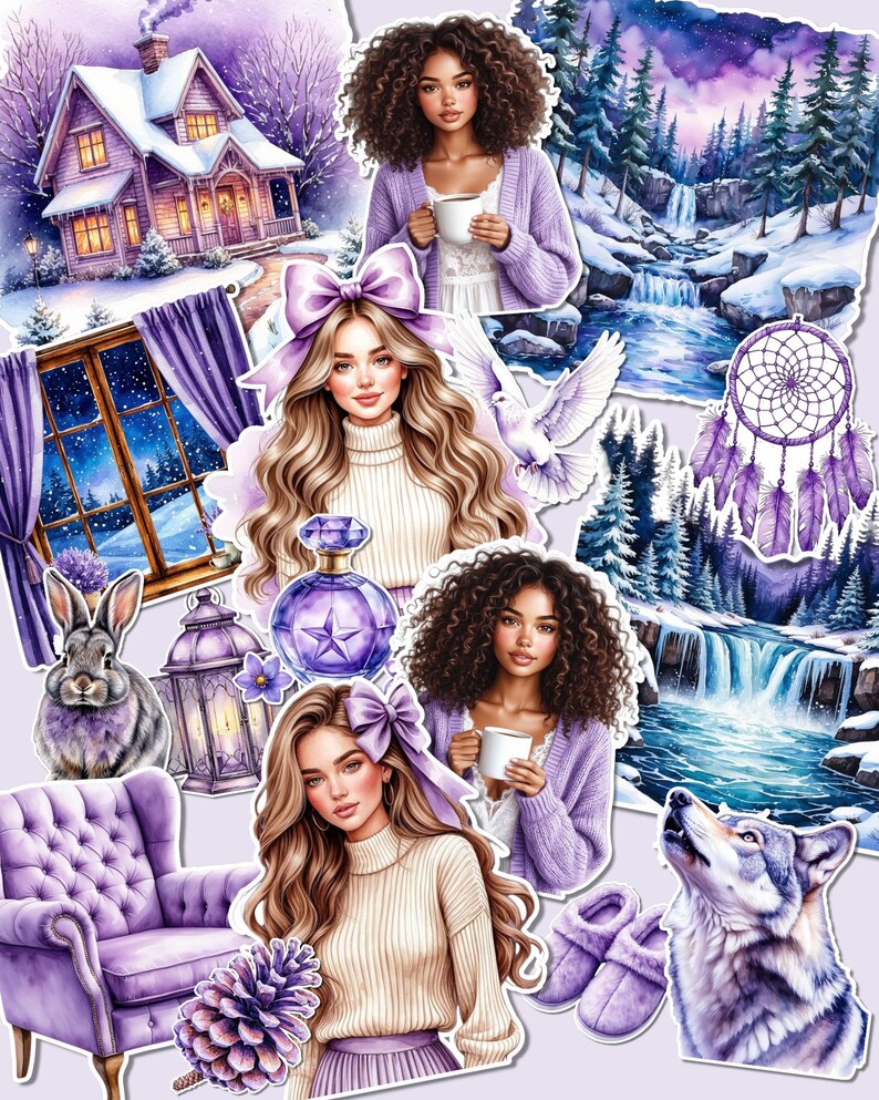 Lot de 17 Cozy winter vibes in soft purple tones stickers for journaling| Scrapbooking | Crafts| planners •
