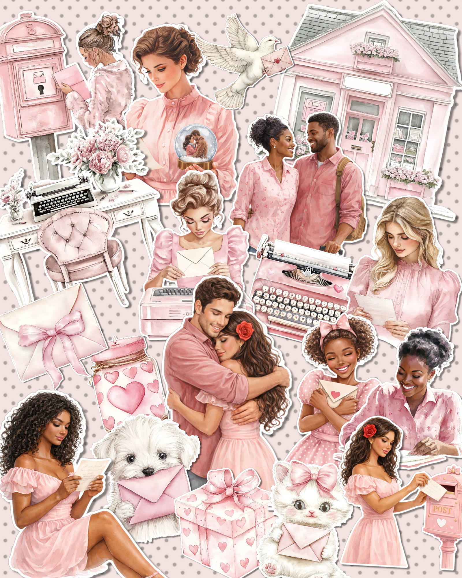 Lot de 17 pink valentine stickers for journaling| Scrapbooking | Crafts| Hand Arts •