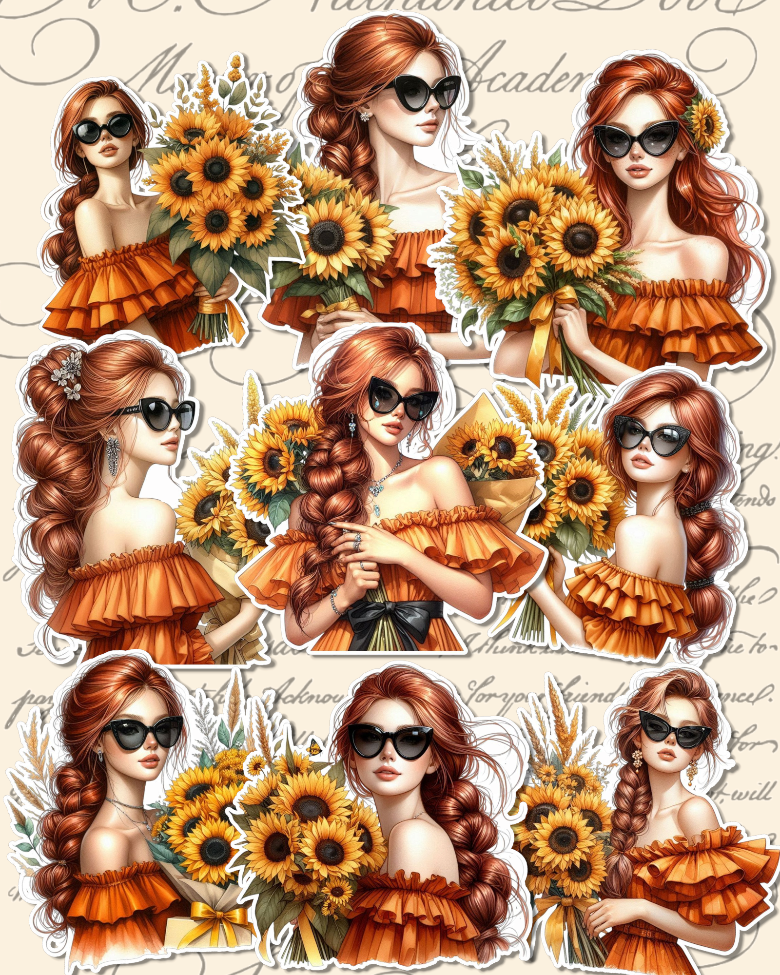 Lot of elegant sunflower girl stickers for journaling, Scrapbooking, Crafts, HandArts•