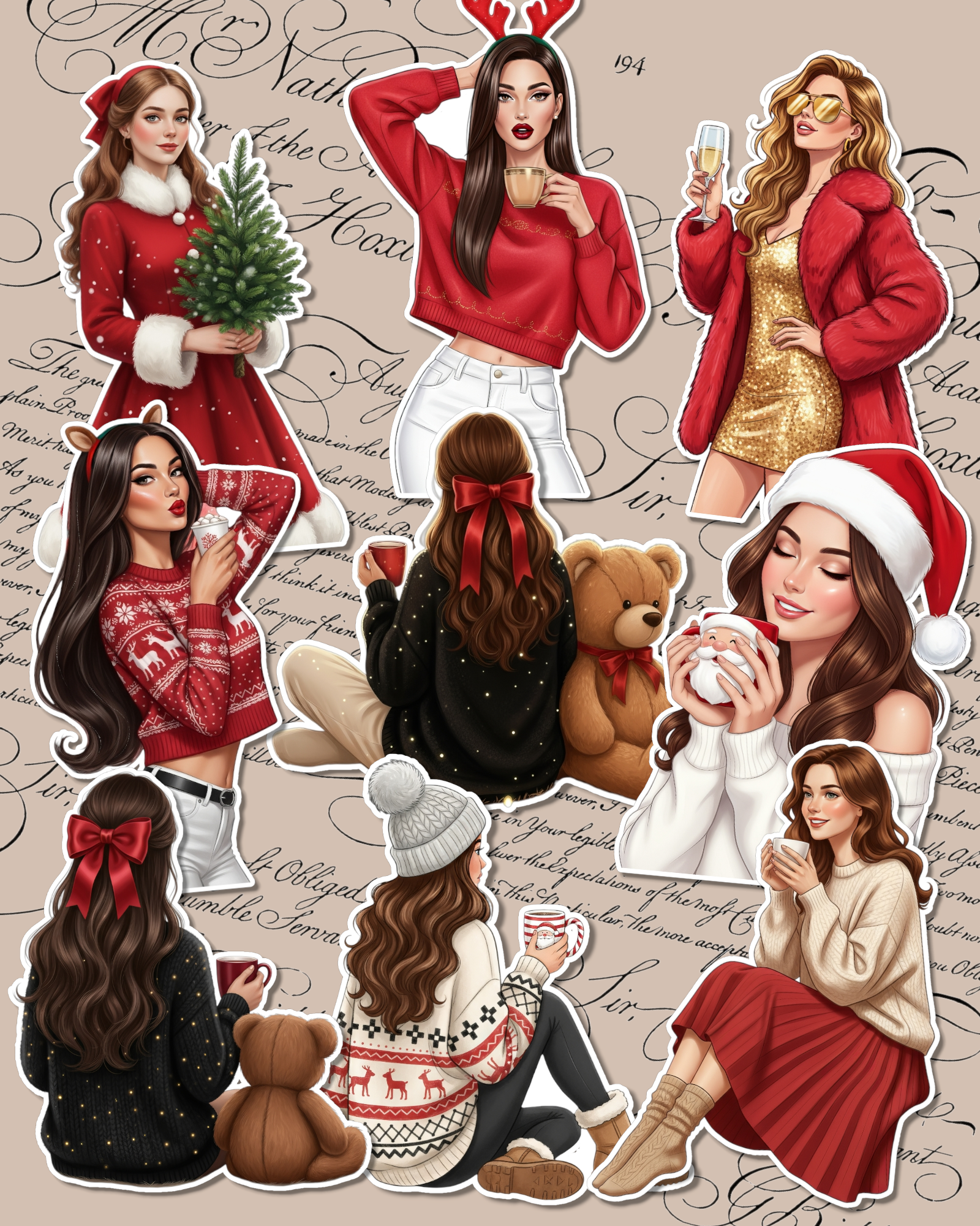 Set of Happy Christmas Girls stickers for Journaling, Scrapbooking, Crafts,plannings.